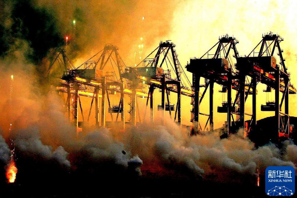 2008年12月6日,在上海洋山深水港三期工程建成仪式上,烟花在北港区码头上绽放。新华社记者 陈飞 摄