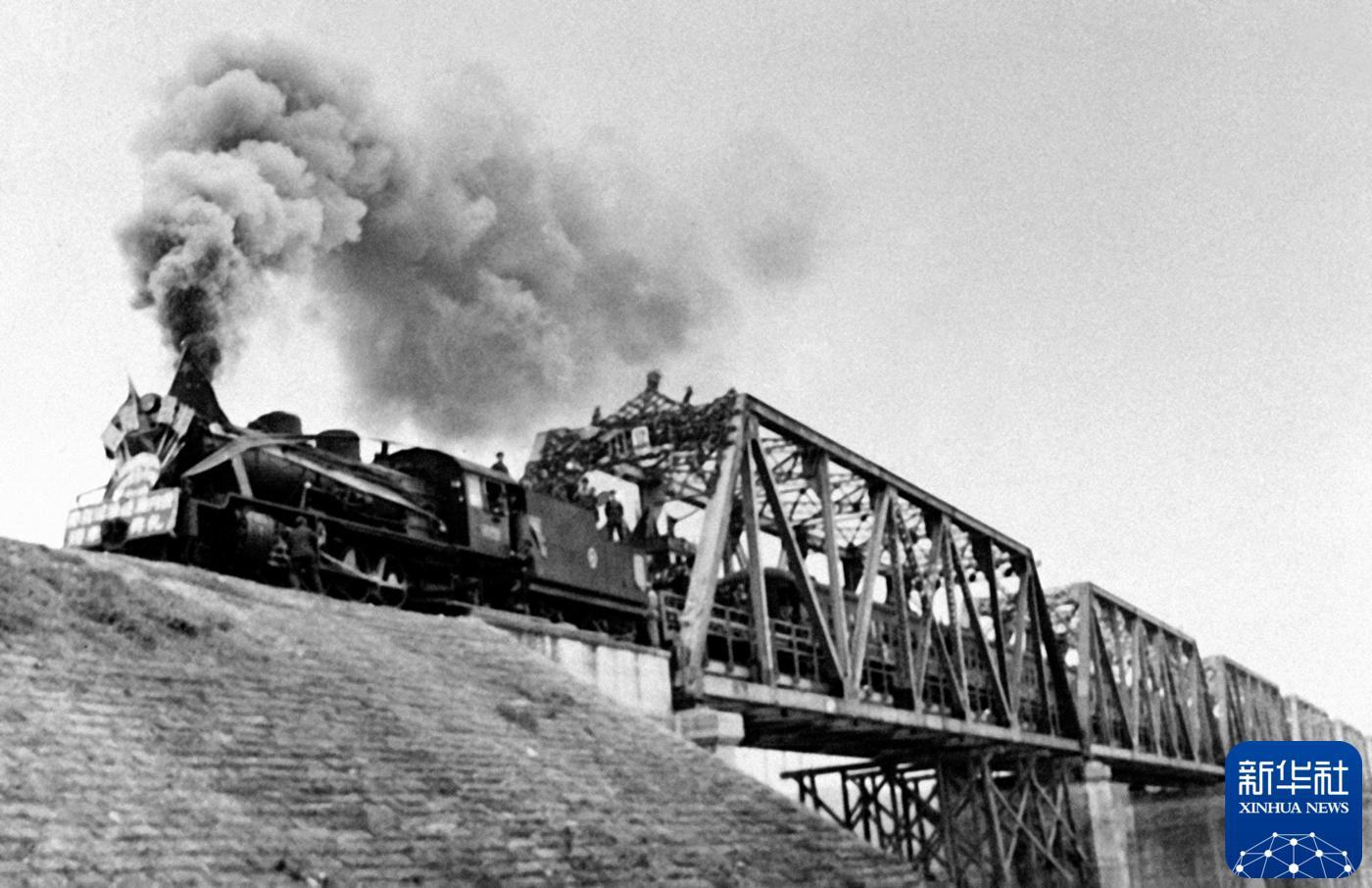 1951年12月,成渝铁路沱江大桥建成通车后,第一列火车通过大桥。新华社发