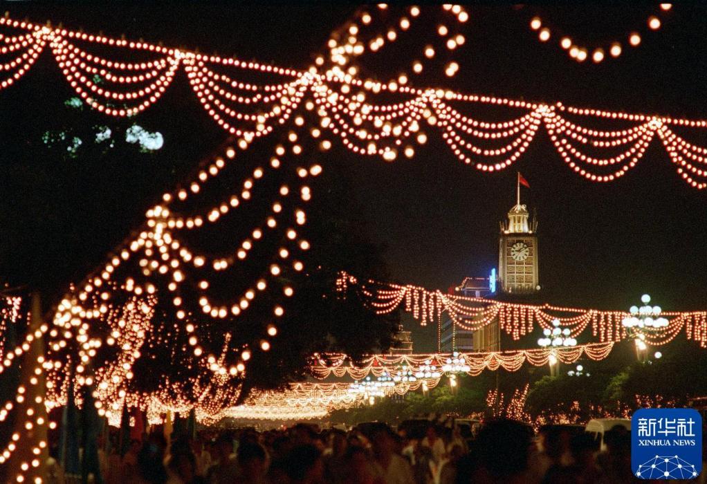1997年6月,在西长安街上,通体明亮的北京电报大楼与沿街装饰灯交相辉映。新华社记者 陈晓伟 摄