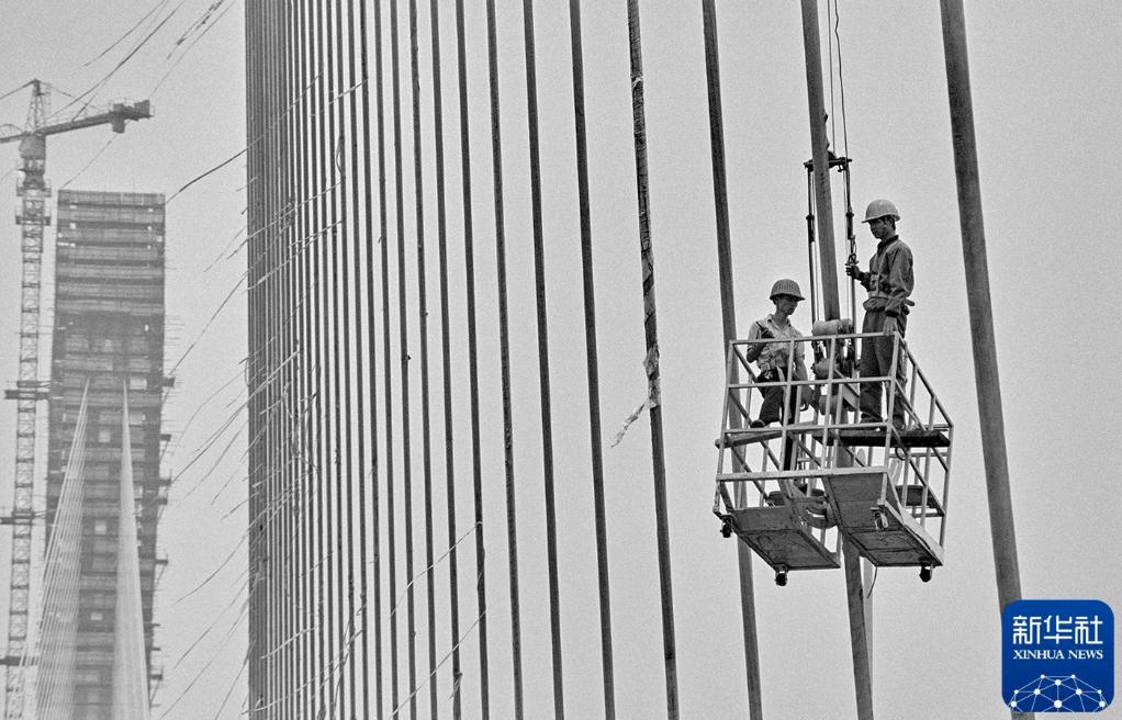 1993年7月28日,上海杨浦大桥建设工人乘小型斗车高空作业。新华社记者 张郇 摄