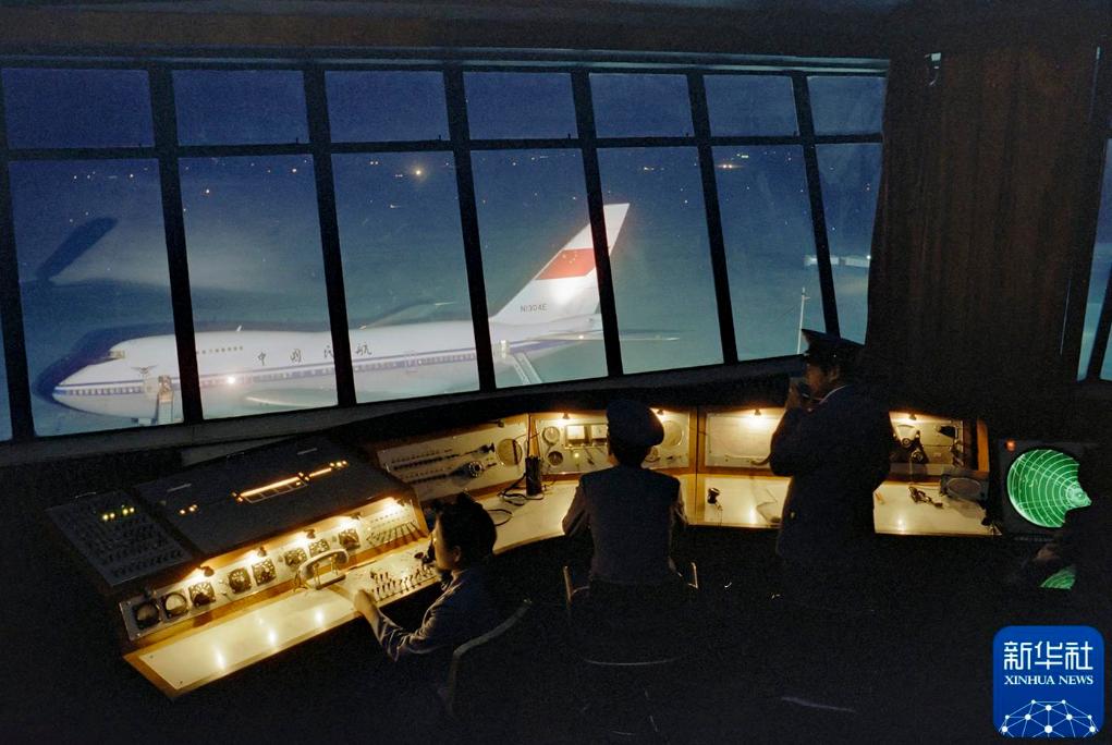 1984年12月,上海虹桥机场指挥塔工作人员在夜间工作。新华社记者 杨溥涛 摄
