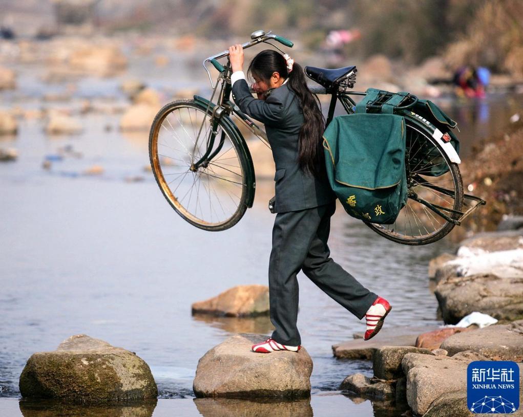 2007年1月6日,江西铅山县陈坊邮政代办所乡村邮递员罗细英扛着自行车过河。 新华社记者 陈春园 摄