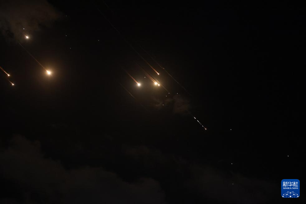 10月1日,以军防空系统拦截的发射物从耶路撒冷上空飞过。新华社发(贾马尔·阿瓦德摄)