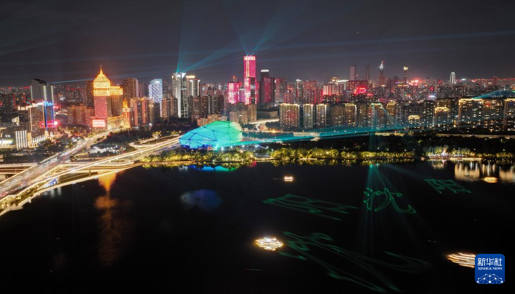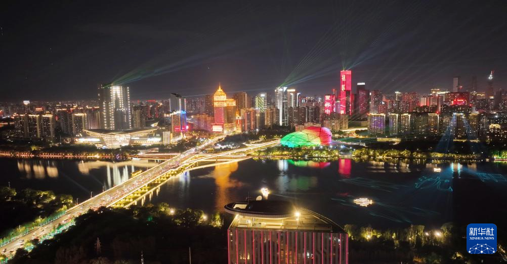 10月1日在辽宁沈阳拍摄的灯光秀(无人机照片)。