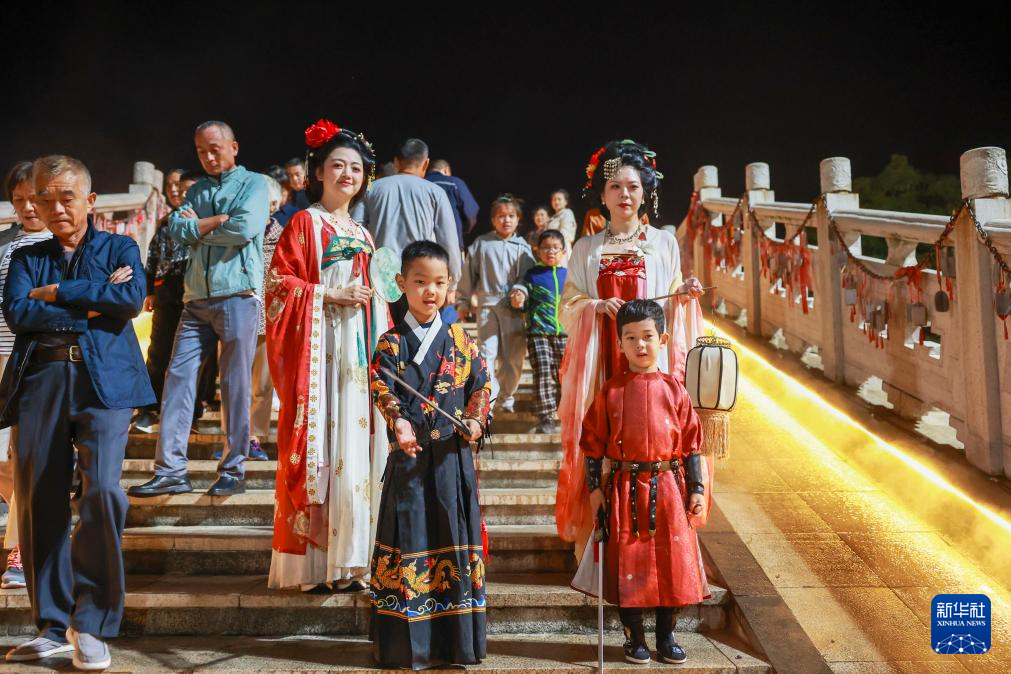 10月1日,在四川省巴中市恩阳古镇,游客观看文艺表演。