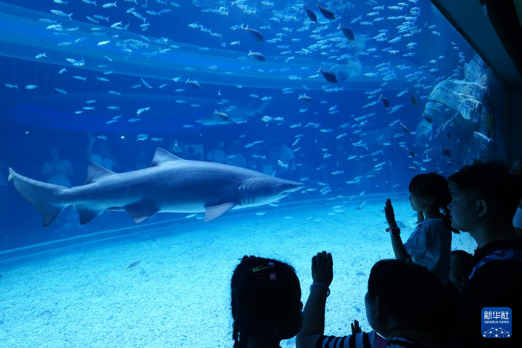 10月1日,在深圳市盐田区小梅沙海洋世界,游客在观赏鲨鱼。