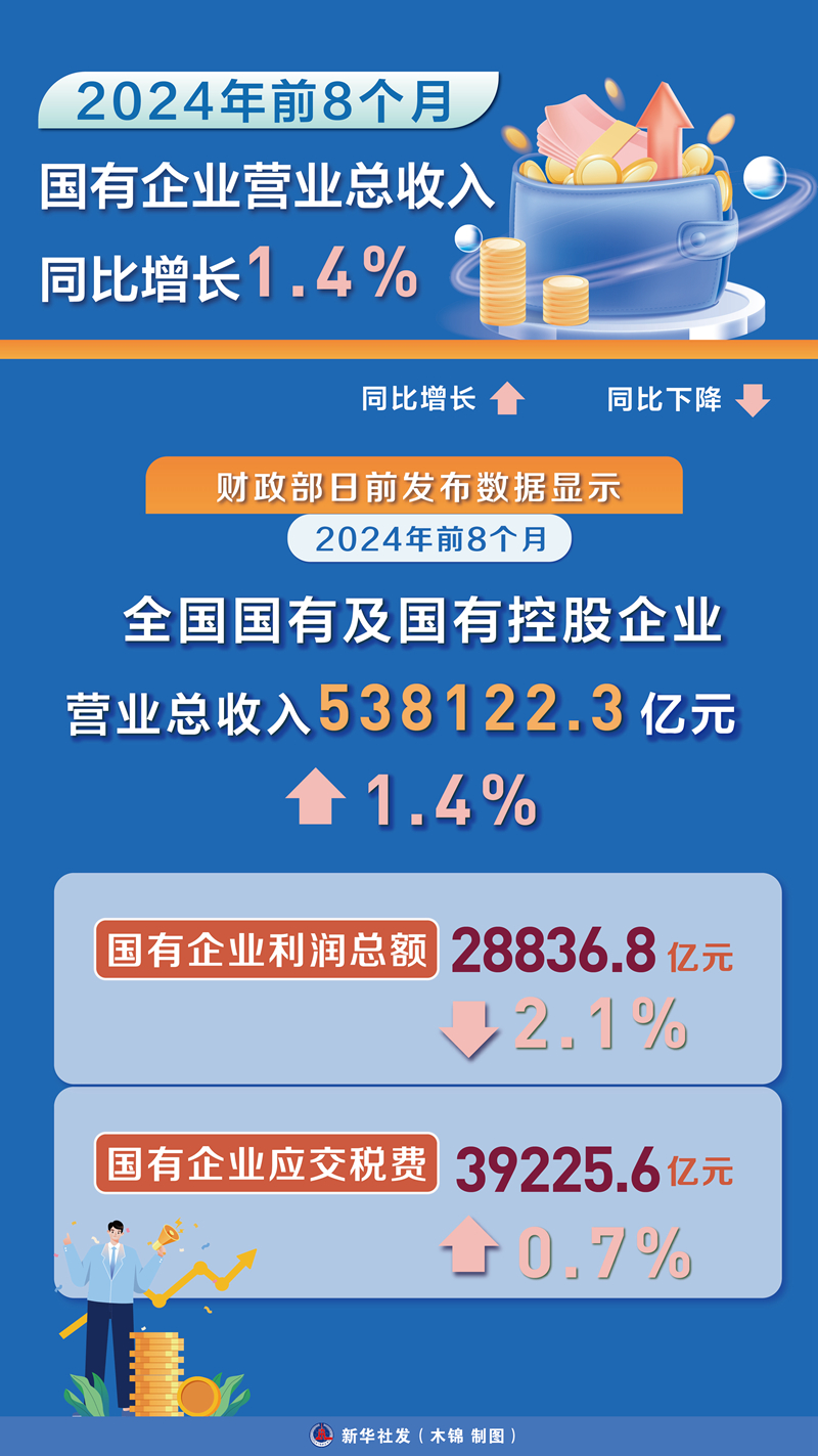 新华社北京10月3日电 财政部日前发布数据显示,今年前8个月,全国国有及国有控股企业营业总收入538122.3亿元,同比增长1.4%。