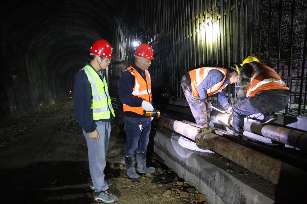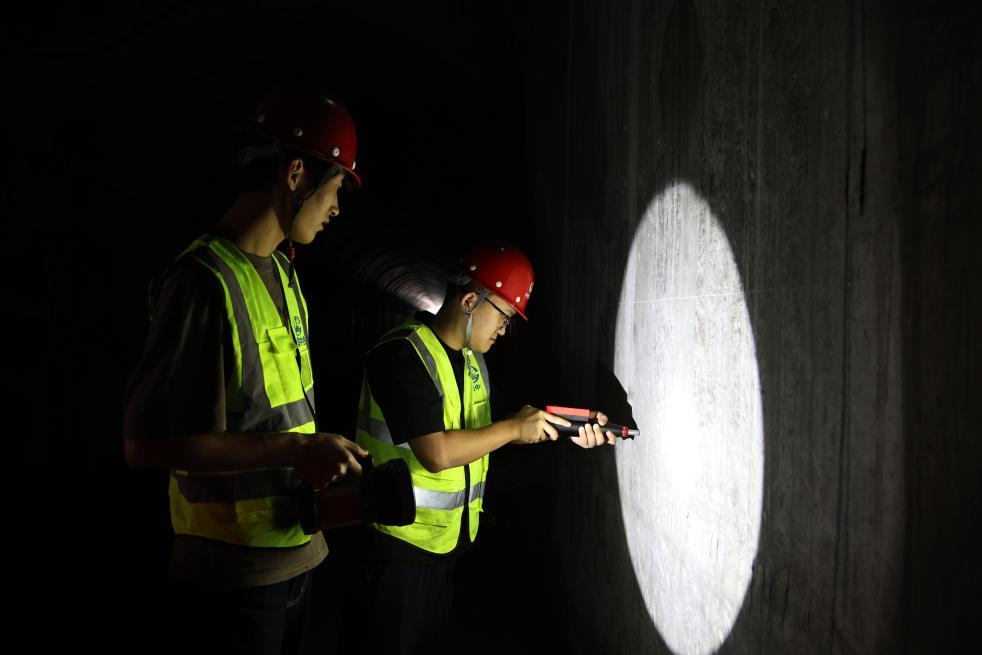 图为施工人员正在测试隧洞内混凝土强度。新华社发(曾令刚摄)