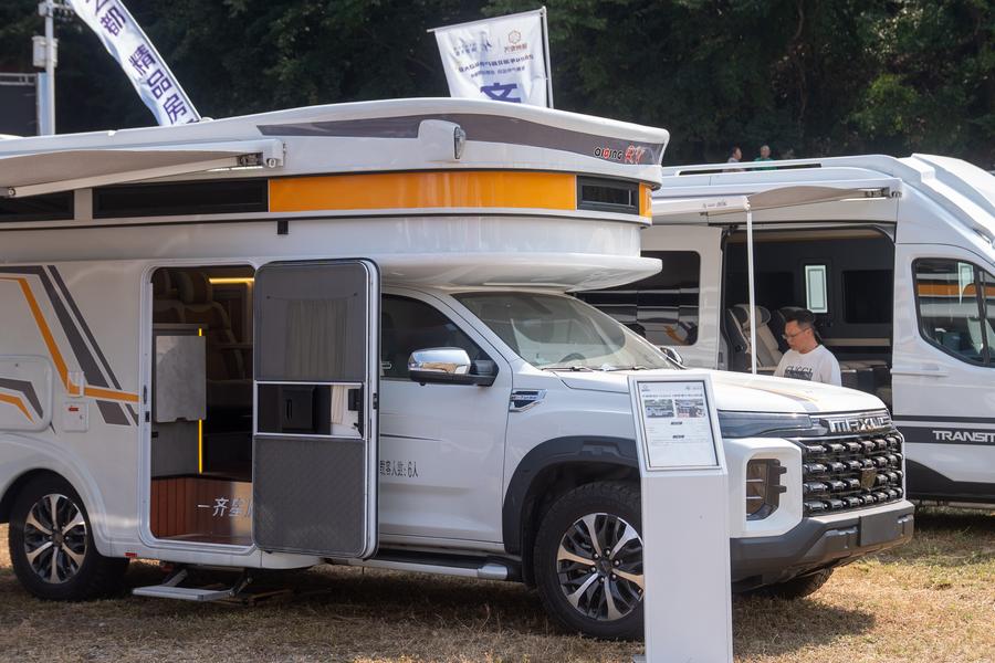 9月28日,参观者在户外运动装备展上参观房车。新华社记者 杜子璇 摄