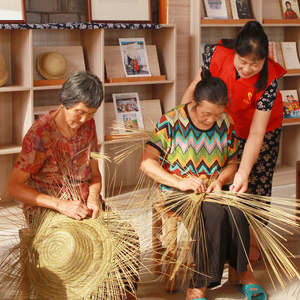 在浙江临海市东塍镇岭根村共富工坊内,村民正在制作草编工艺品。(梁蕙薇 摄)