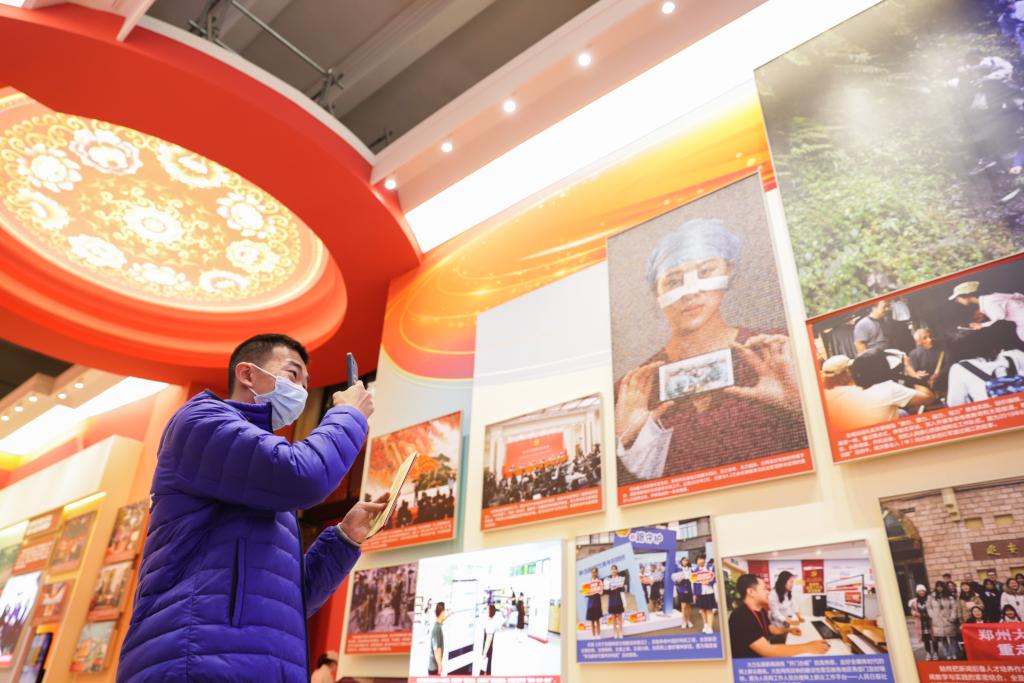 2022年10月10日,观众在“奋进新时代”主题成就展第五单元“坚定文化自信 建设社会主义文化强国”展厅内参观。新华社记者 张玉薇 摄