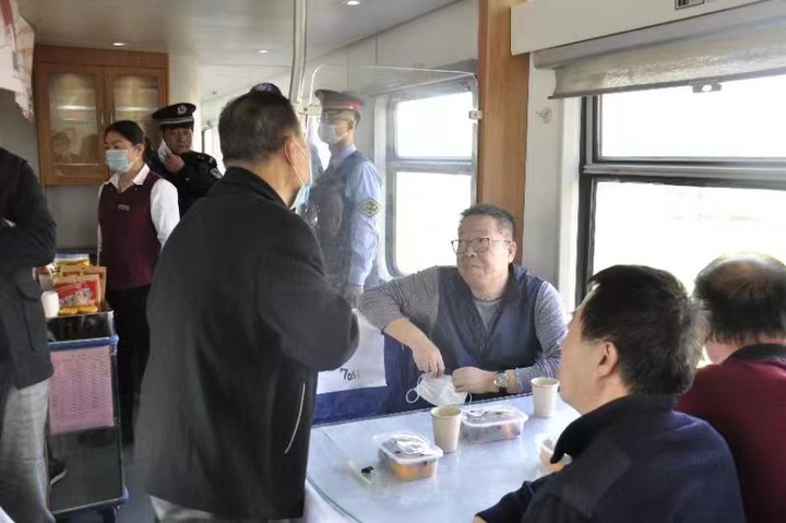 高满堂(座位居中者)在列车上同乘务人员交谈。受访者供图