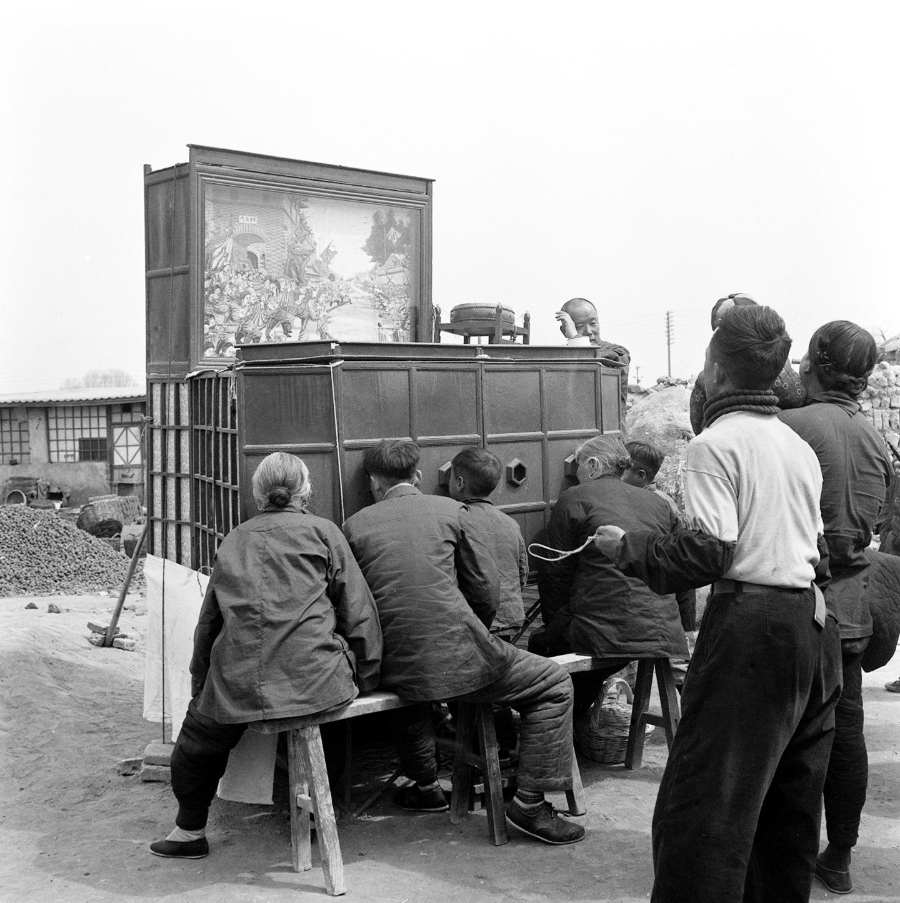 1957年4月,人们在北京蟠桃宫庙会上观看拉洋片。新华社发