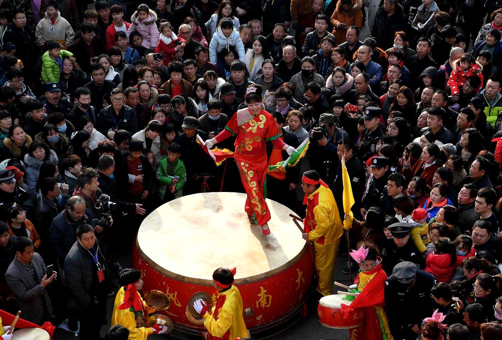 2018年3月2日,一支锣鼓队在河南浚县古庙会上表演。新华社记者 李安 摄