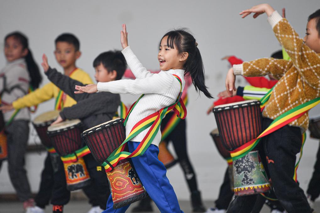 2022年1月19日,小朋友们在海南儋州和庆镇六罗乡村大舞台排练乡村春晚节目。新华社记者 蒲晓旭 摄