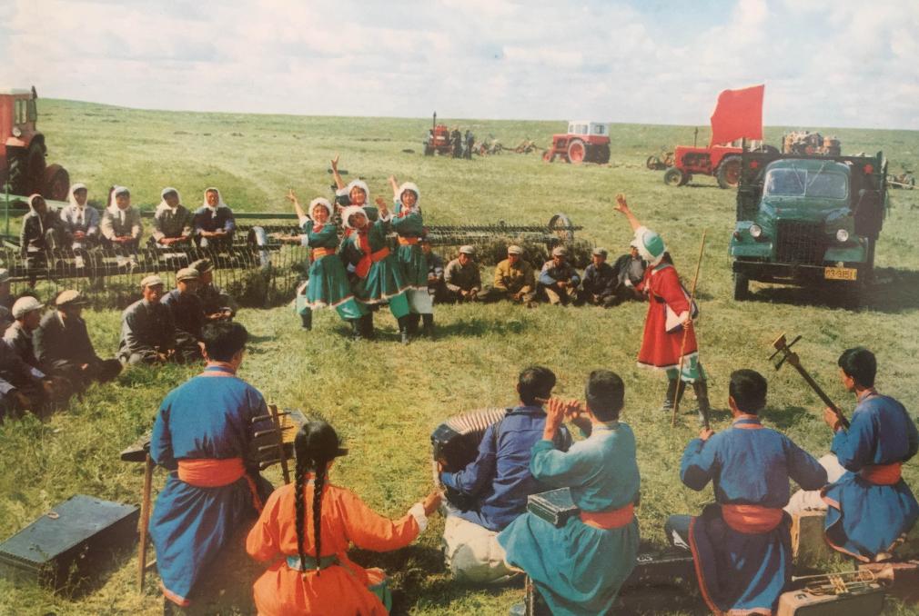20世纪70年代,内蒙古锡林郭勒盟乌兰牧骑队员在草原上为牧民演出。新华社发
