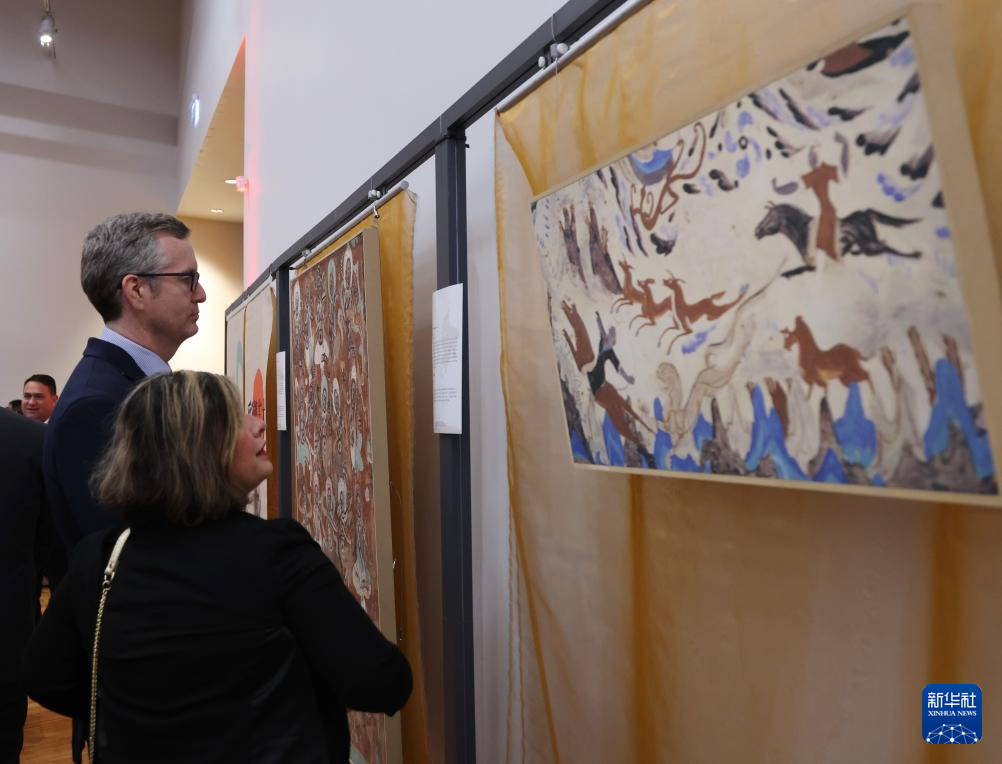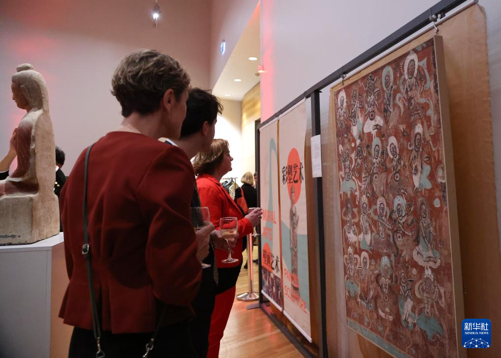 9月26日晚,在新西兰首都惠灵顿举行的中国驻新西兰大使馆国庆招待会上,嘉宾们驻足观看敦煌文化展。新华社发(孟韬摄)