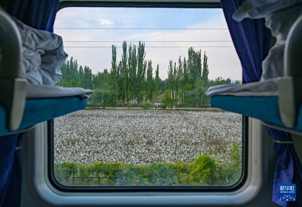 在新疆阿克苏,列车从一处棉田旁驶过(9月26日摄)。新华社记者 陈朔 摄