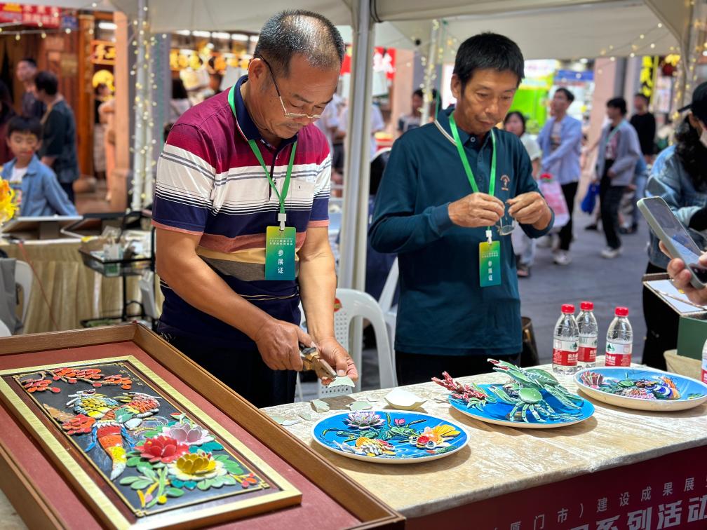 10月4日,在厦门中山路的非遗摊位上,剪瓷雕非遗传承人王国强(左)现场进行剪瓷雕展示。新华社记者 付敏摄
