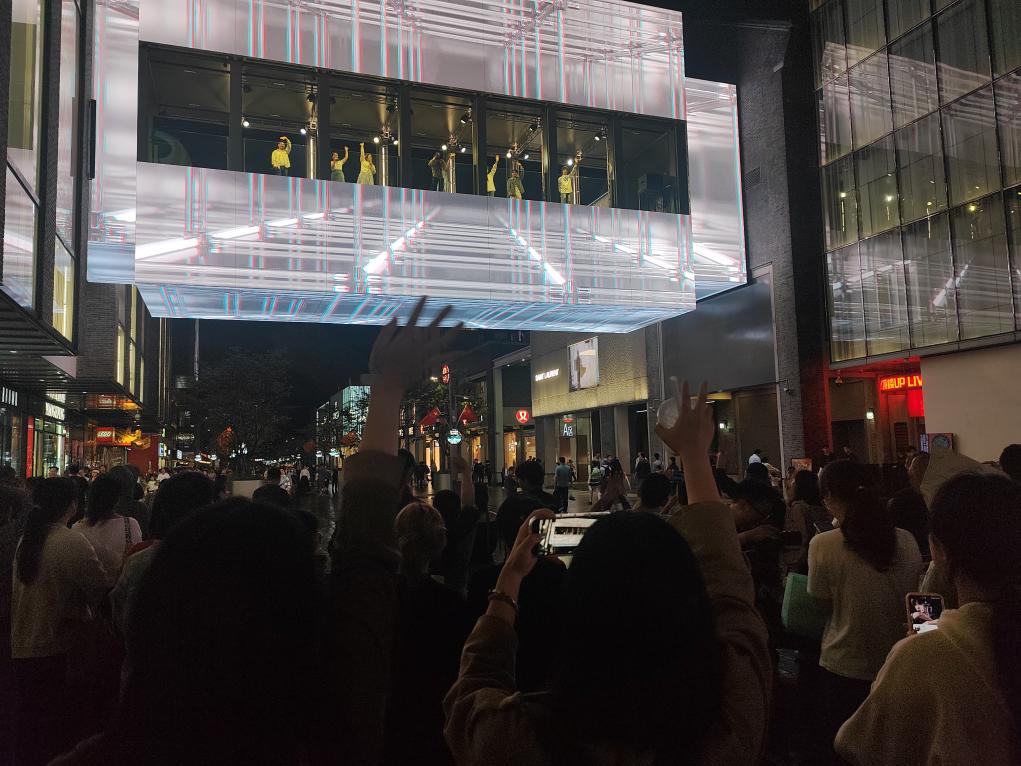 10月5日晚,在杭州湖滨步行街上,随着室外大屏缓缓展开,连接两座商厦的“西子廊桥”灯光亮起,杭州当地一支人声乐团以一曲无伴奏合唱,吸引了众多游人驻足聆听。