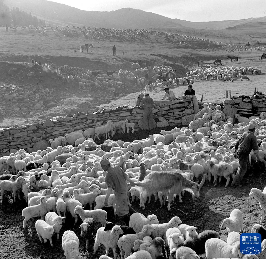 1965年,新疆阿勒泰县克木齐人民公社第一生产队社员们在照料羊羔。新华社记者 徐邦 摄
