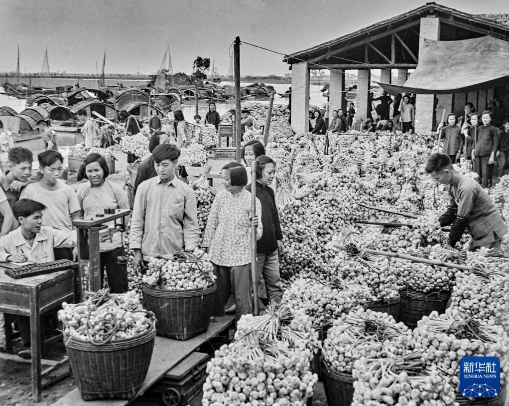 广东开平县沙岗公社新东大队各生产队社员把收获的上等蒜头卖给国家。(1962年3月31日发)新华社记者 罗清 摄
