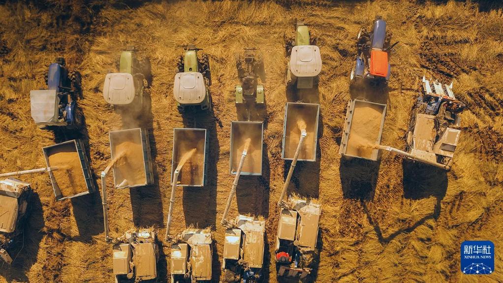 2021年10月20日,在辽宁铁岭市铁岭县新台子镇西三家子村,人们把机械化收割下来的水稻装车。新华社记者 杨青 摄
