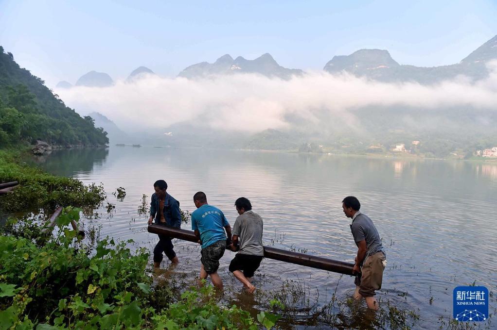 2016年8月18日,在广西大化瑶族自治县板升乡弄雷村,工人们抬着抗旱饮水工程的水管在河水中前行。新华社记者 黄孝邦 摄