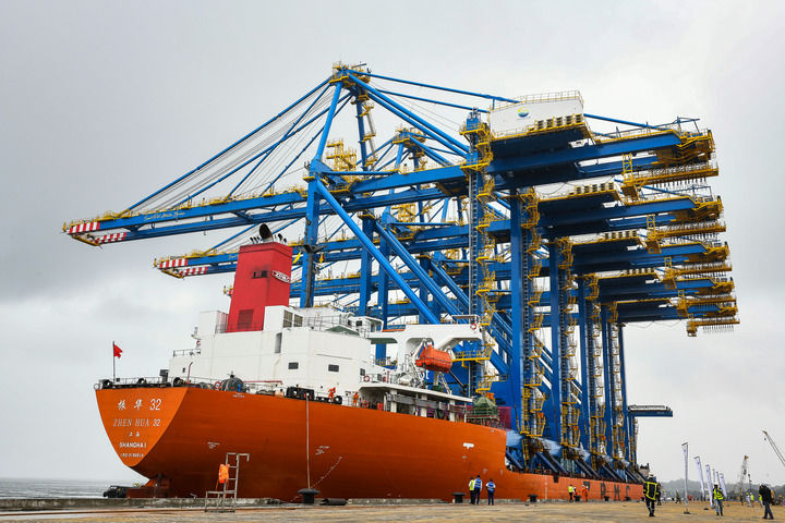 9月12日,一艘来自中国的大型特种运输船运载着数架港口起重机停靠在喀麦隆克里比深水港二期码头。新华社发(科普索摄)