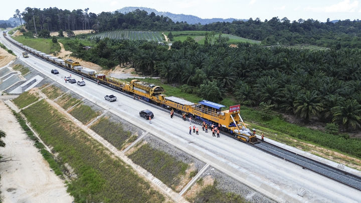 这是5月6日在马来西亚彭亨州航拍的马东铁项目的铺轨现场。新华社记者 程一恒 摄