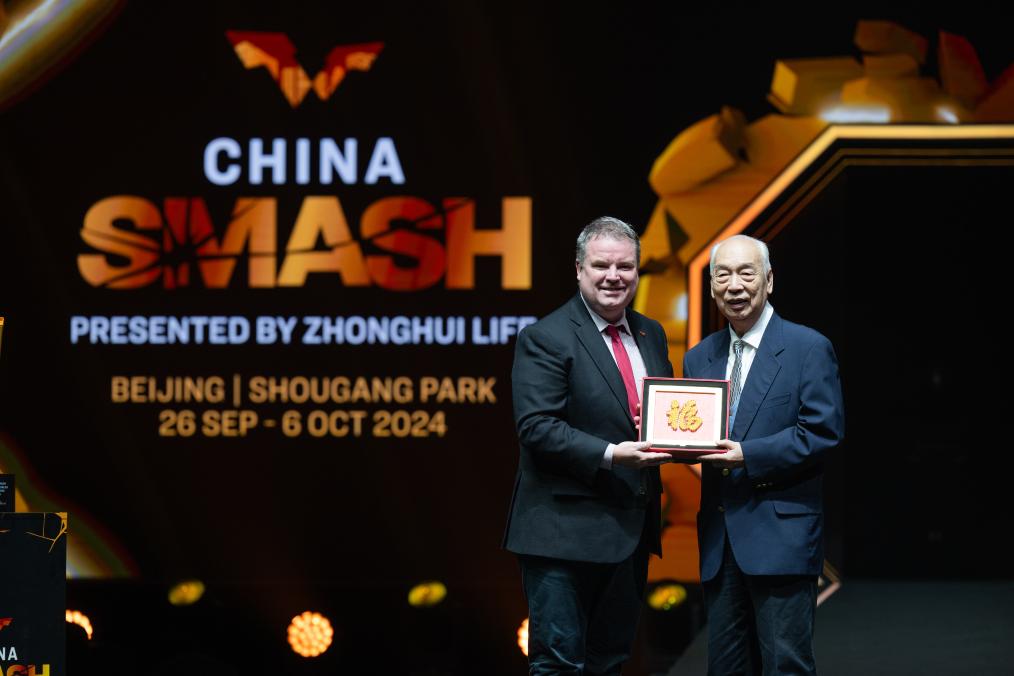 10月4日,史蒂夫·丹顿向“体育工作杰出贡献者”国家荣誉称号获得者张燮林(右)赠送纪念品。新华社记者 肖艺九 摄