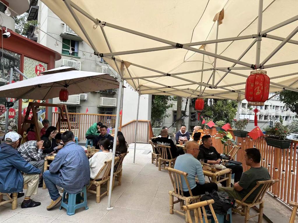 来自湖北十堰市的张举霖一家人,则选择围坐在社区街角的坝坝茶铺前,几杯清茶配上花生、瓜子、红枣……这就是休闲舒适的国庆假期时光。“在民主村里,既有古朴的老房、老树,又有咖啡馆、非遗馆等创意化、年轻化的新业态,老生活与新时尚的搭配,让这里很有味道。”张举霖告诉记者。