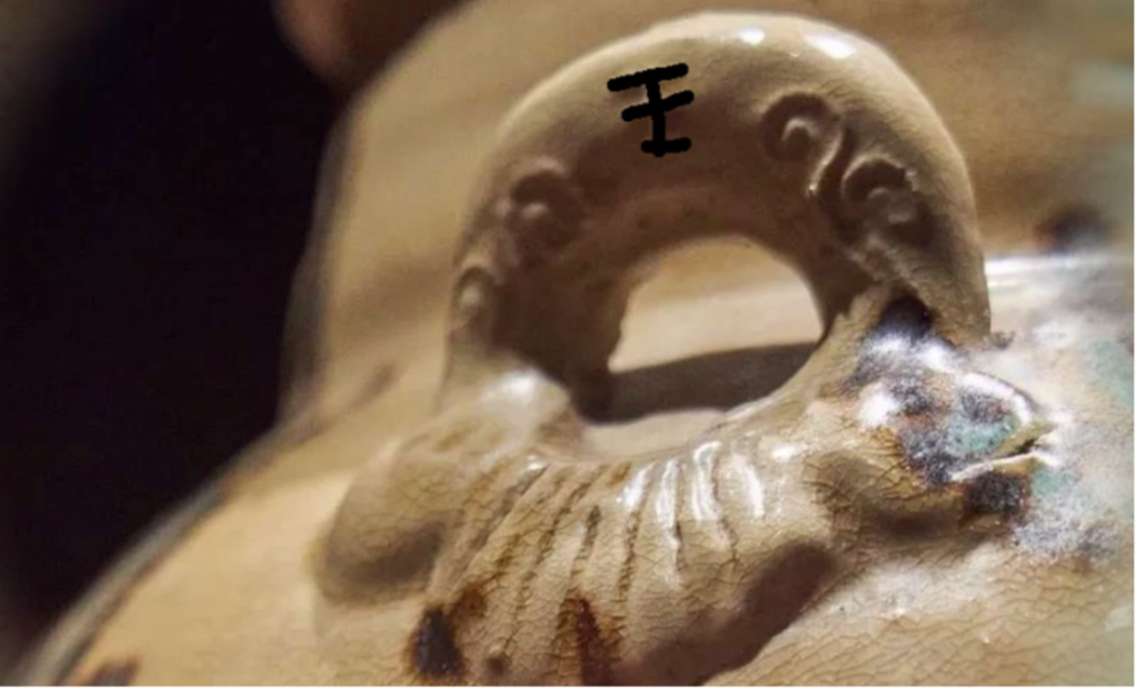 青釉褐绿点彩云纹双耳罐的罐身印有“王”的字样。图片来源:扬州日报社