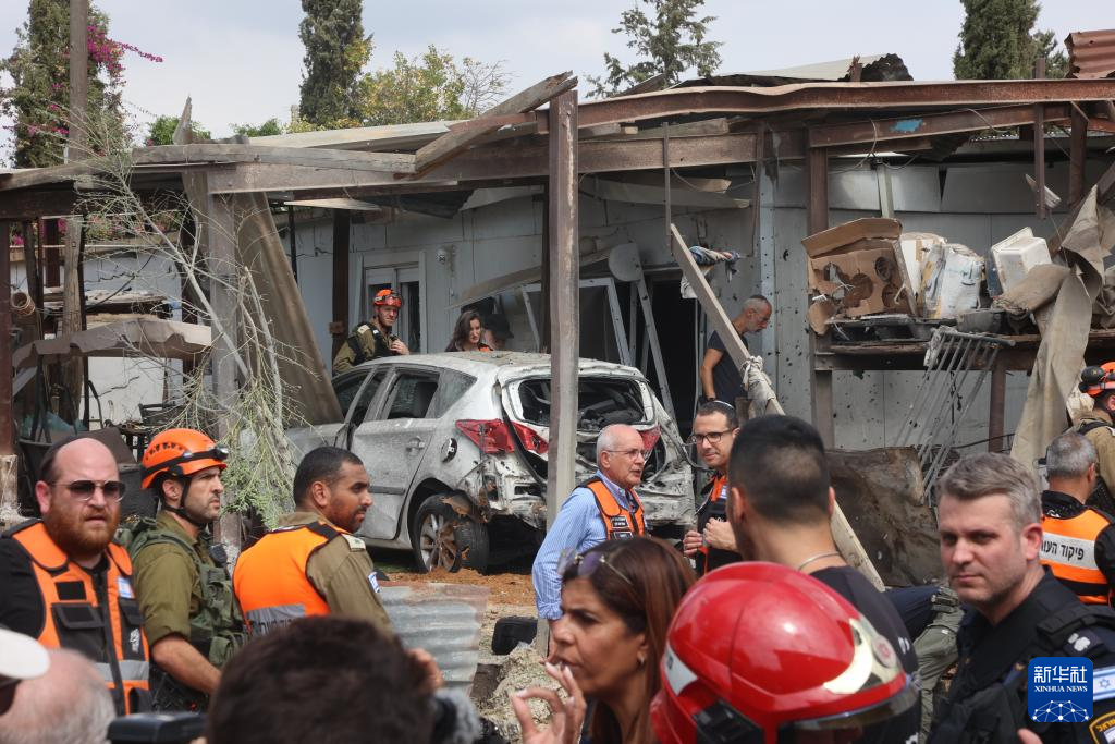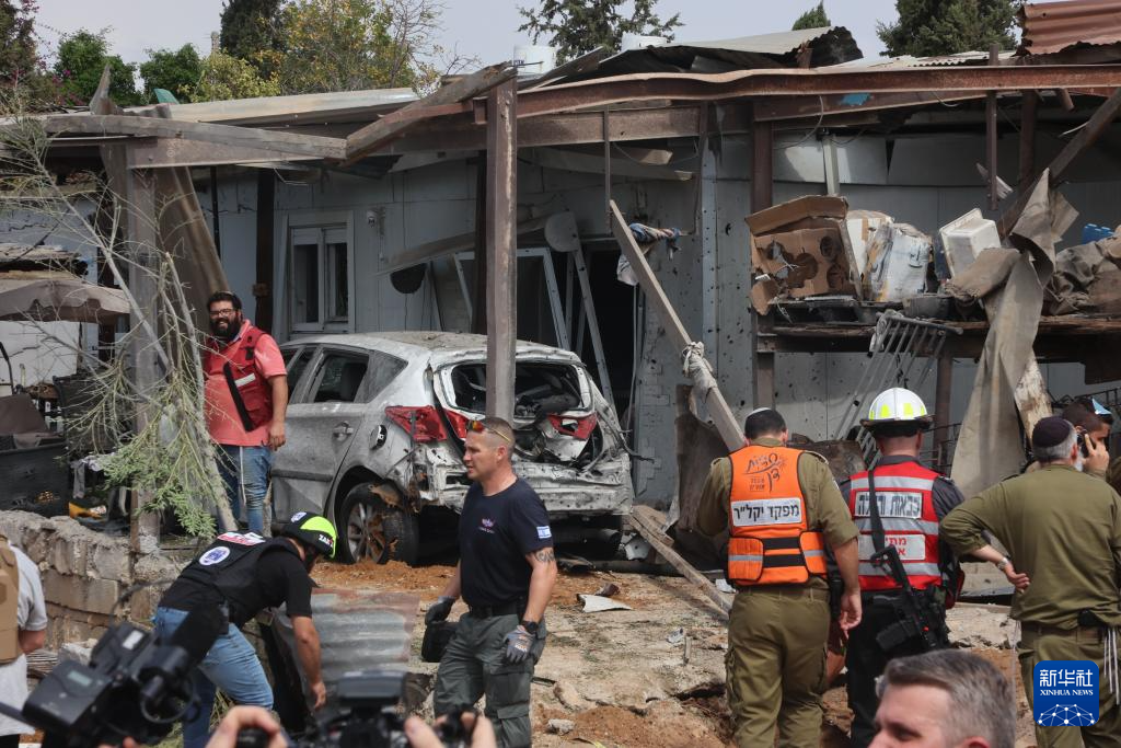 10月7日,在以色列特拉维夫附近的哈巴德村,救援人员在火箭弹袭击现场工作。 新华社发(吉尔·科恩·马根摄)