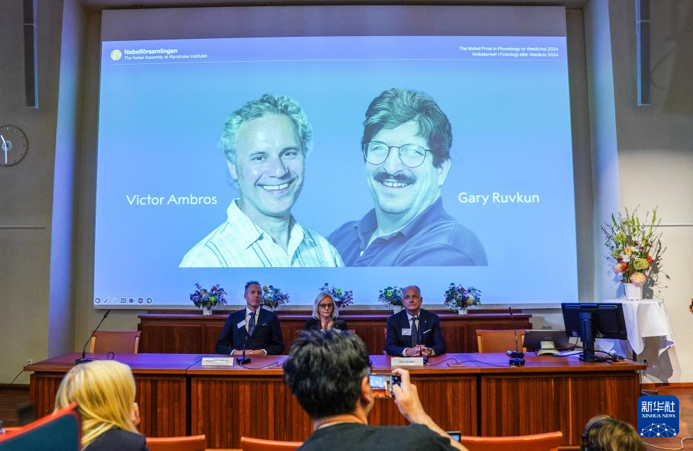 10月7日,在瑞典斯德哥尔摩举行的2024年诺贝尔生理学或医学奖公布现场,屏幕显示奖项得主美国科学家维克托·安布罗斯(左)和加里·鲁夫坎的照片。新华社记者 彭子洋 摄