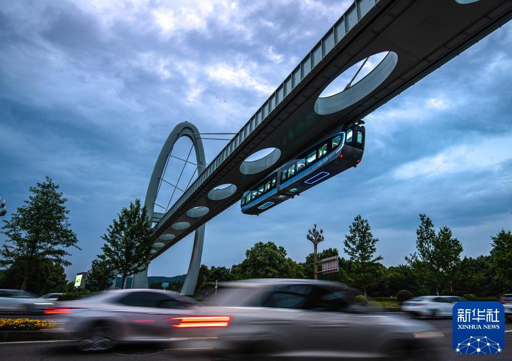 2023年5月9日,武汉“光谷光子号”空轨列车悬挂于轨道梁下方凌空“飞行”。
