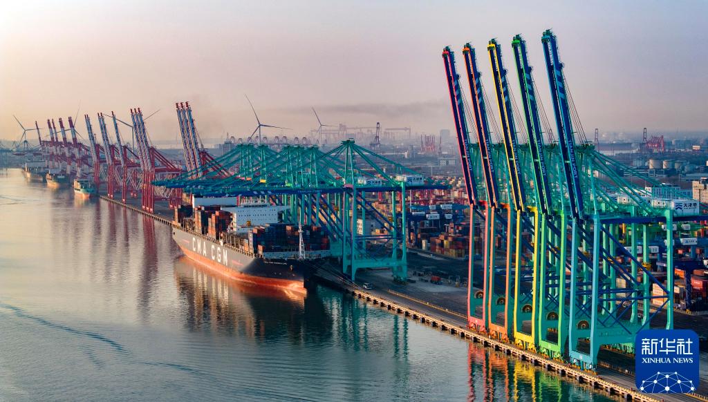 2024年2月2日,一艘集装箱货轮停靠在天津港“智慧零碳”码头。