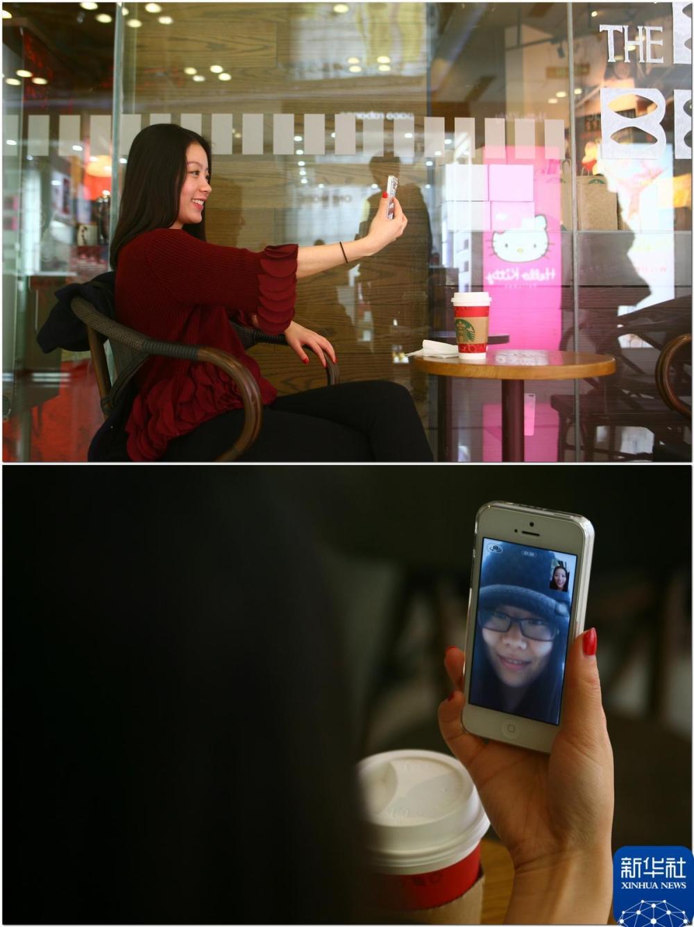 2013年12月5日,一名女士在北京一家咖啡厅用微信和远方的朋友视频聊天(拼版照片)。