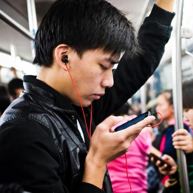 2012年11月10日,在北京地铁四号线海淀黄庄站,一名乘客在站台候车时使用手机听音乐。