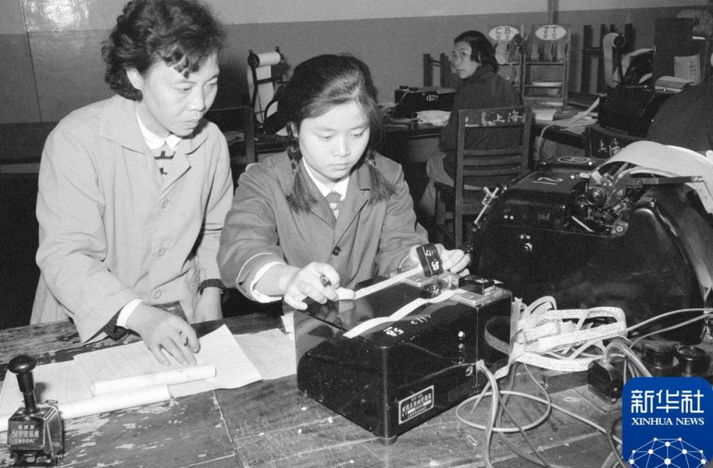 1979年,在成都市电信局,工作人员在指导新学员发电报。