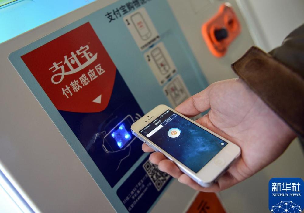 2014年1月10日,一名支付宝员工在办公楼内的购物机前演示手机支付流程。