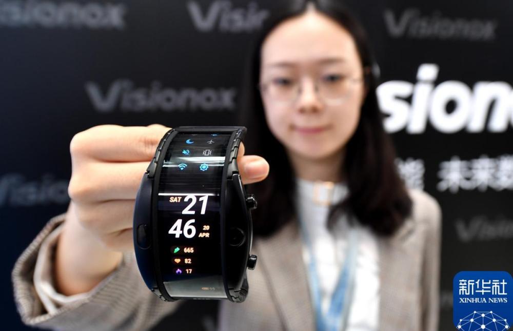 2019年10月11日,工作人员在数博会上展示一款柔性显示智能可穿戴手机。