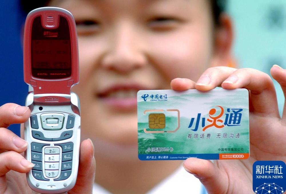 2005年5月17日,在浙江杭州,营业员在展示一款小灵通手机和一张小灵通SIM卡。