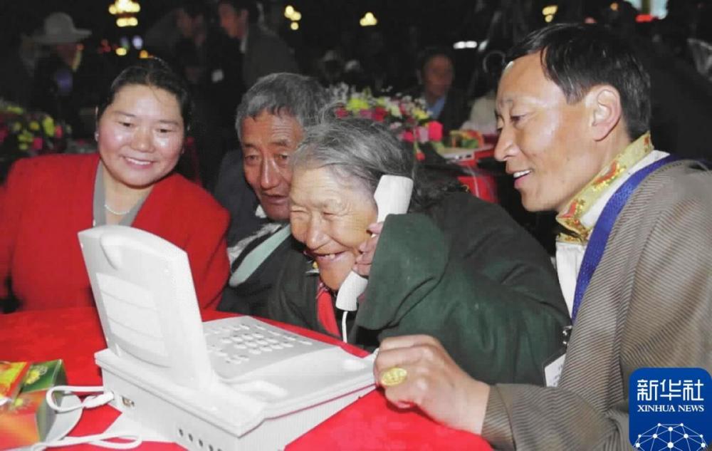2001年10月1日,在西藏拉萨,牧民通过可视电话和在北京上学的孙子通话。