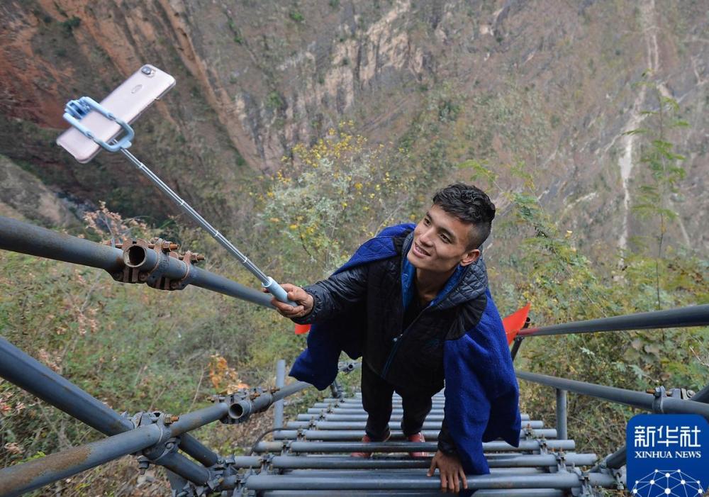 2017年12月15日,四川省凉山州“悬崖村”村民在钢梯上做直播。