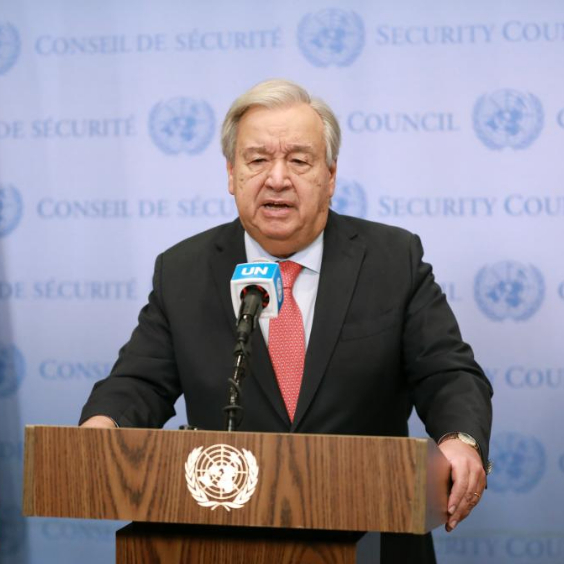 10月8日,在位于纽约的联合国总部,联合国秘书长古特雷斯(上左一)对媒体讲话。新华社记者 谢锷 摄