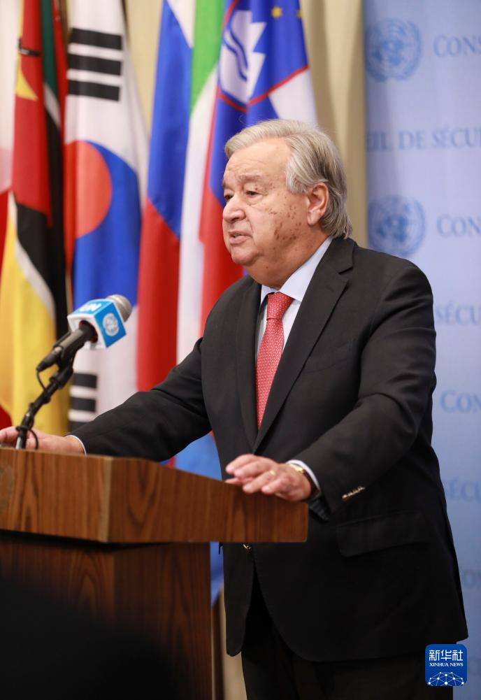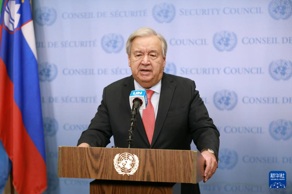 10月8日,在位于纽约的联合国总部,联合国秘书长古特雷斯(上右一)对媒体讲话。新华社记者 谢锷 摄