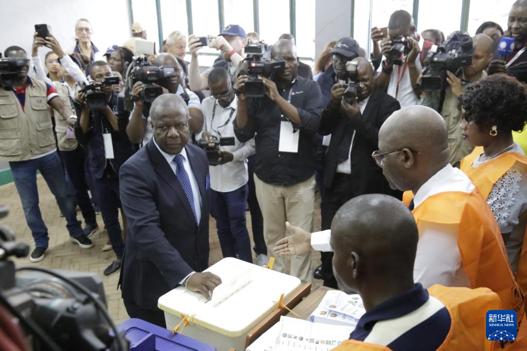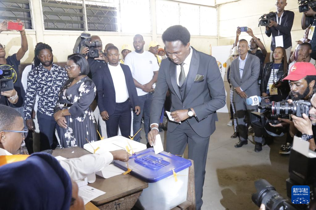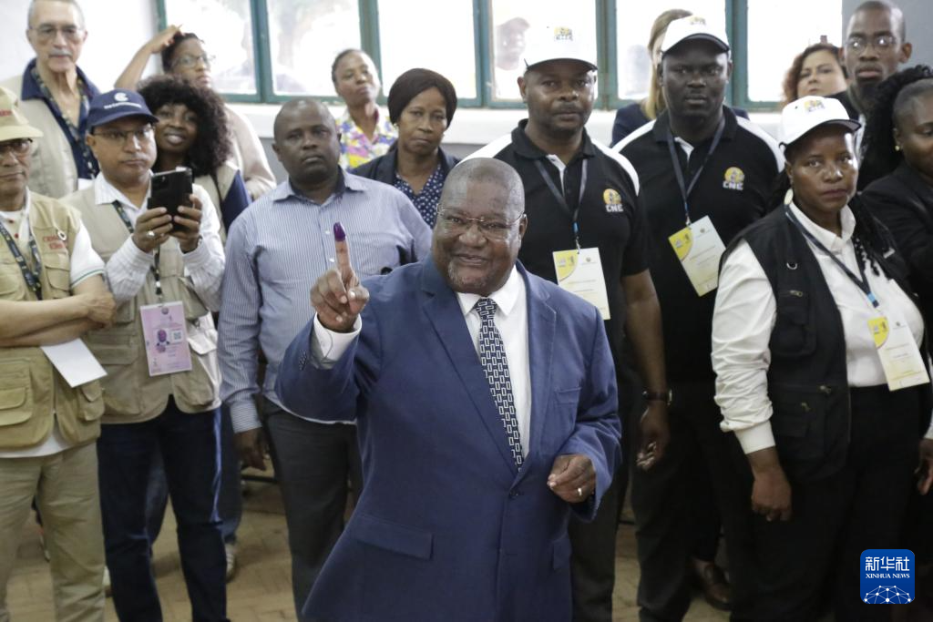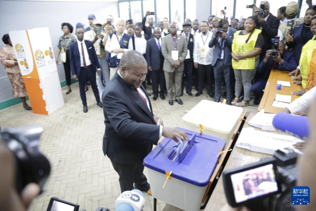 莫桑比克总统纽西当天上午在马普托一所中学的投票站投票,并呼吁选民积极参与投票。