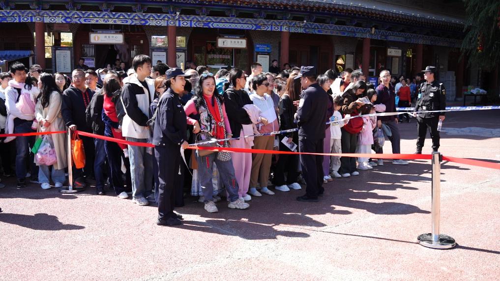 小西天景区采取限流措施,游客有序排队等候。(张瑞强 摄)