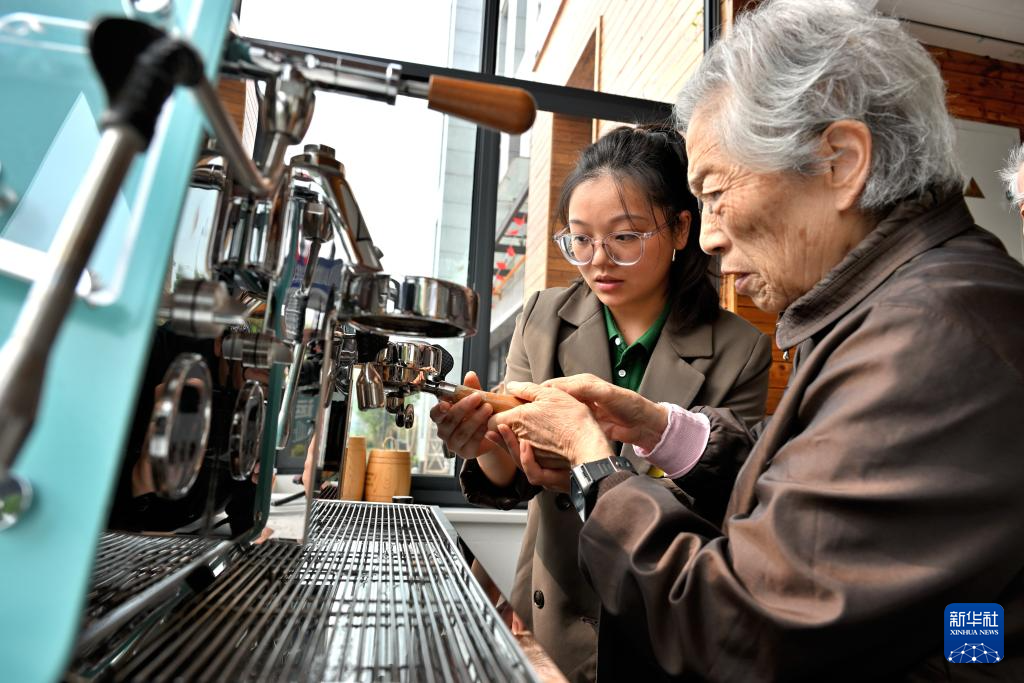 10月9日,在“忘不了”咖啡厅,周奶奶在社工的指导下制作拿铁咖啡。